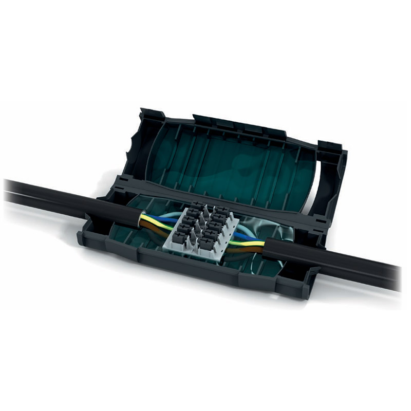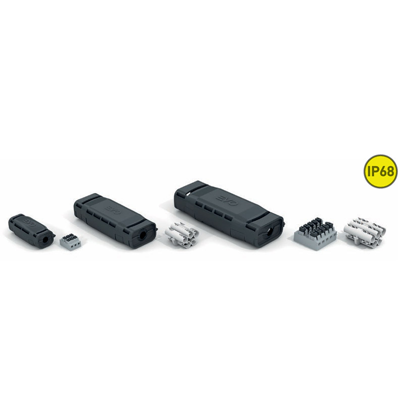 EVO® es la nueva gama de empalmes aislados en gel, que permite conexiones rectas y en derivación con grado de protección IP68 en los tipos de cable más comunes de las instalaciones eléctricas, con secciones de hasta 5 × 16 mm² (rectos) y hasta 3 × 4 mm² (derivación).