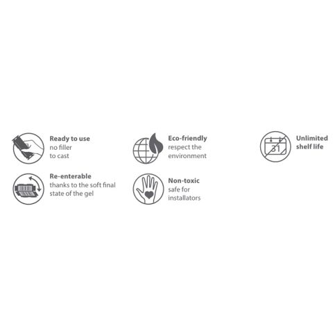 Los empalmes EVO® se caracterizan por un diseño renovado con líneas ergonómicas y conservan todas las características distintivas de la tecnología prellenada con gel: instalación fácil y rápida, fiabilidad en el tiempo y respeto al medio ambiente.