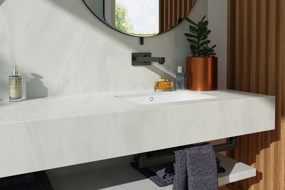 Artista Sage de Corian® es un color de superficie sólida que destaca por su estética suave y contemporánea. Presenta una base verde salvia clara, matizada con partículas finas en tonos grises, blancos y verdes más oscuros, creando una textura sutilmente moteada que aporta profundidad sin distracciones visuales. Su acabado delicado y moderno lo convierte en una elección ideal para espacios que buscan una atmósfera tranquila, natural y sofisticada. Artista Sage armoniza especialmente bien con maderas claras, acabados mate y elementos en tonos tierra o neutros. Además de su atractivo visual, conserva las propiedades técnicas de Corian®: es no poroso, fácil de limpiar, resistente al uso diario y adecuado tanto para aplicaciones horizontales como verticales en entornos residenciales o comerciales.