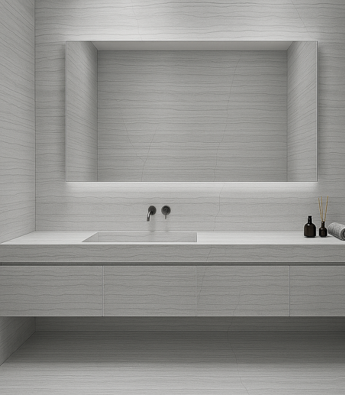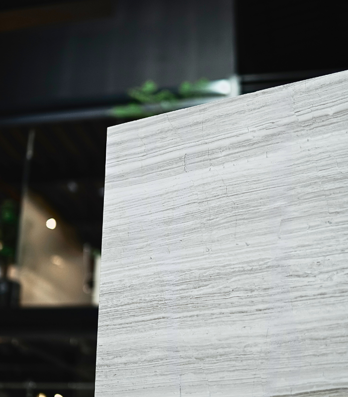 Mármol de vetas finas y lineales que simulan la textura de la madera clara, en tonos blanco, gris y beige. Su acabado pulido aporta luz y sobriedad, ideal para espacios serenos y elegantes.