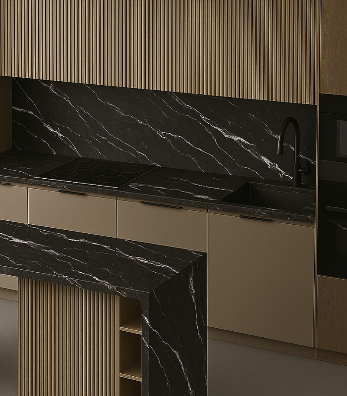 Granito brasileño de fondo negro con vetas blancas irregulares que recuerdan la imagen de una galaxia. Su alto contraste y textura pulida lo hacen perfecto para proyectos decorativos que buscan impacto y distinción.