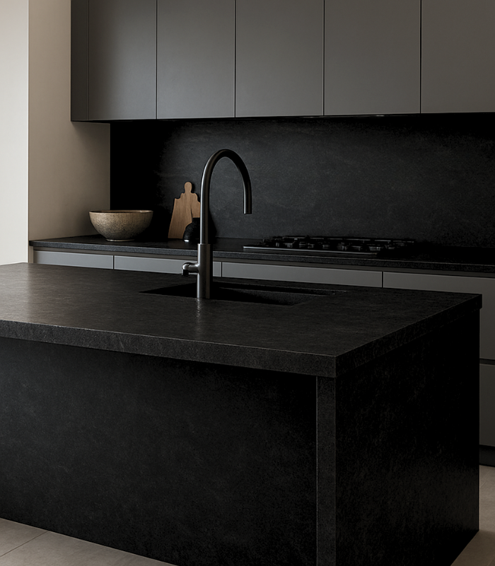 Granito negro de grano fino, con acabado leather que ofrece una textura mate, sutil y elegante. Altamente resistente y de bajo mantenimiento, ideal para cubiertas de cocina, baños y áreas de alto tránsito.