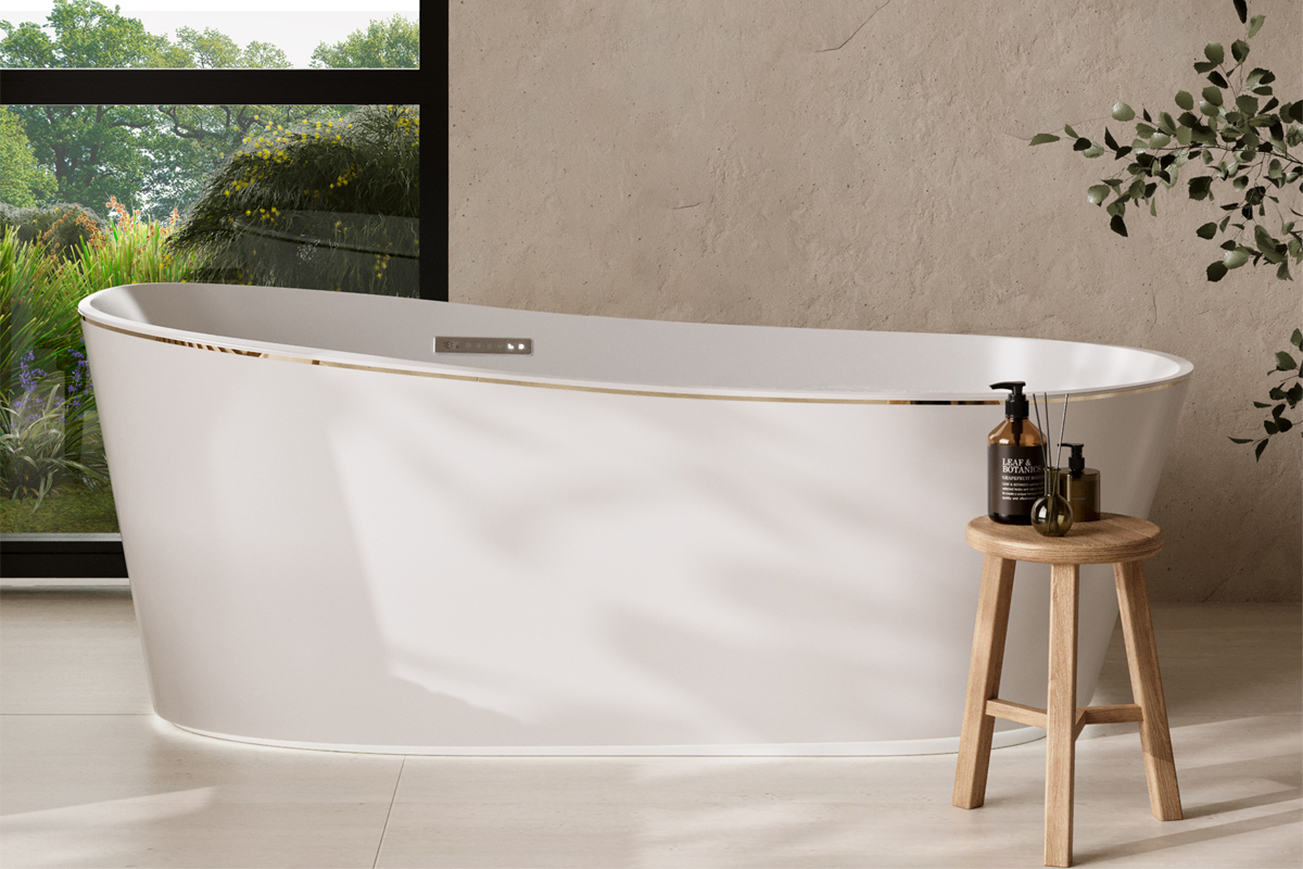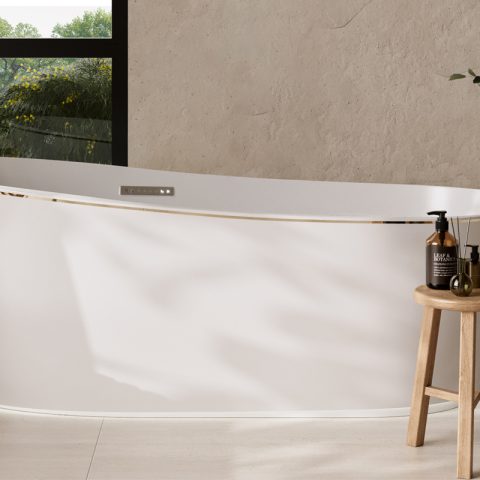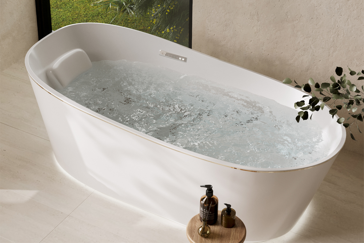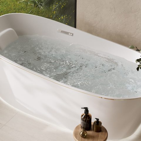 Con 2 metros de largo x 90 cm de ancho y 60 de profundidad. Su diseño ergonómico en la parte inferior se amolda al cuerpo para mayor comodidad y la almohadilla de silicona cuenta con chupones que permiten apoyar la cabeza en la posición que mejor convenga. Además, incorpora una luz cálida decorativa en su inferior que se enciende al acercarse, transformando el cuarto de baño en un ambiente de relajación y serenidad.