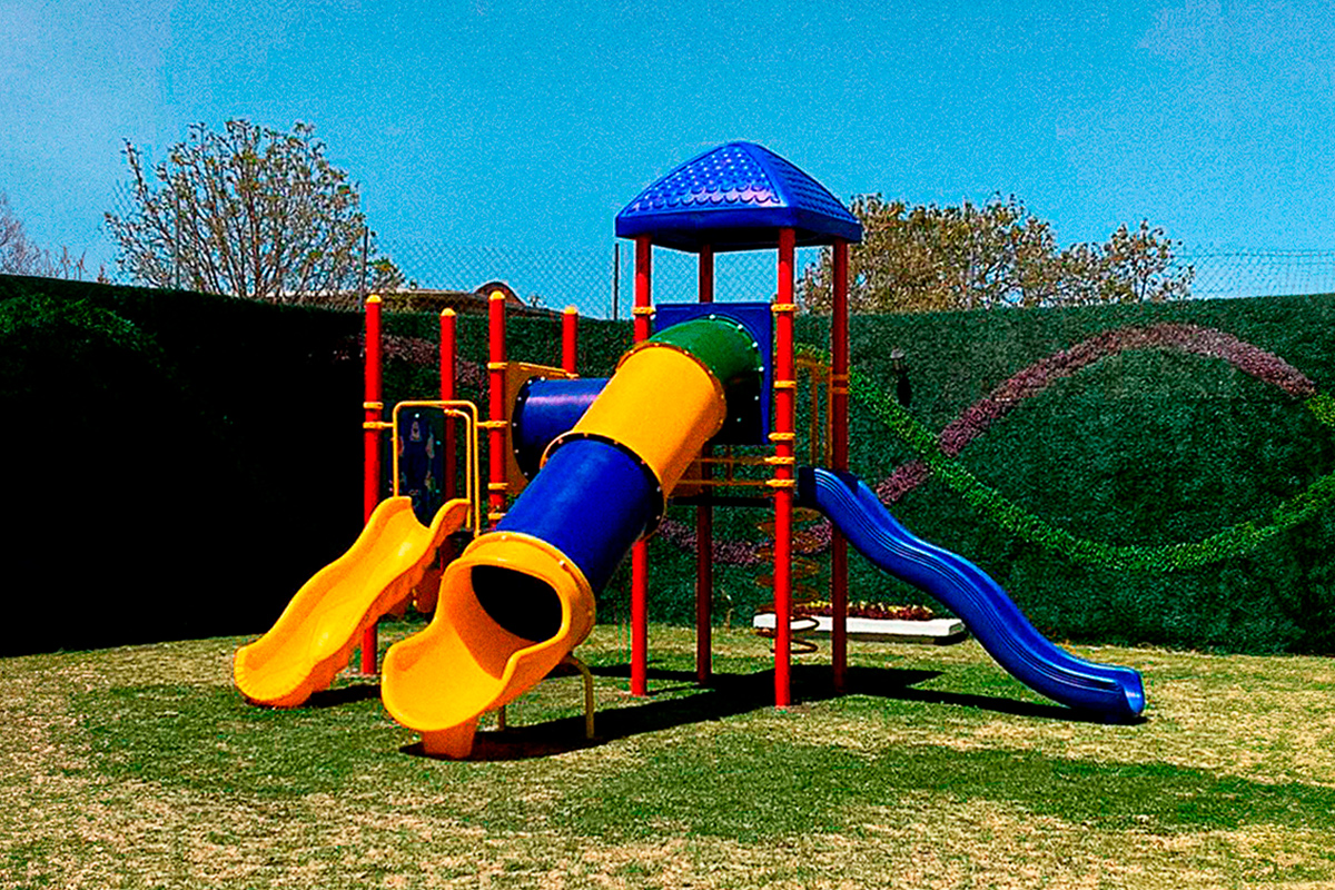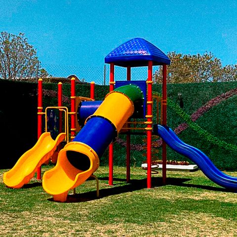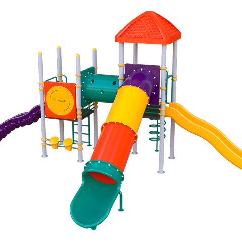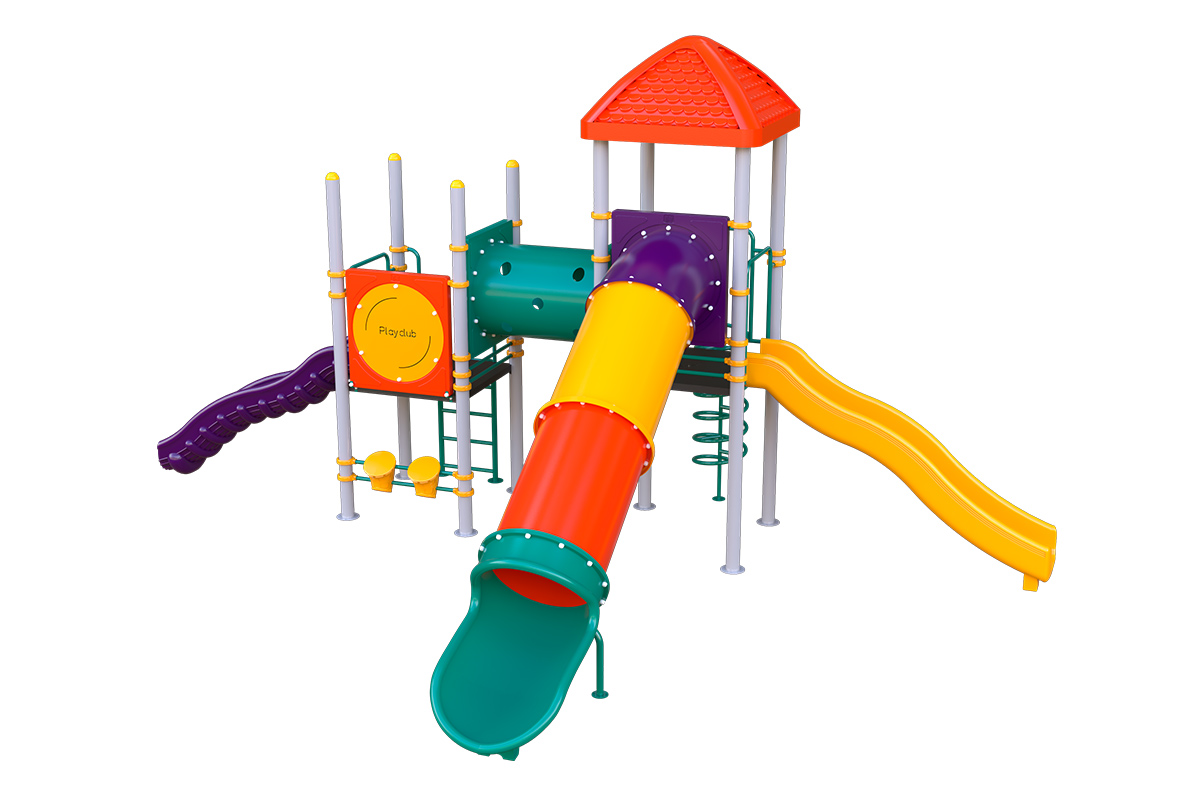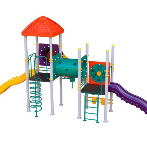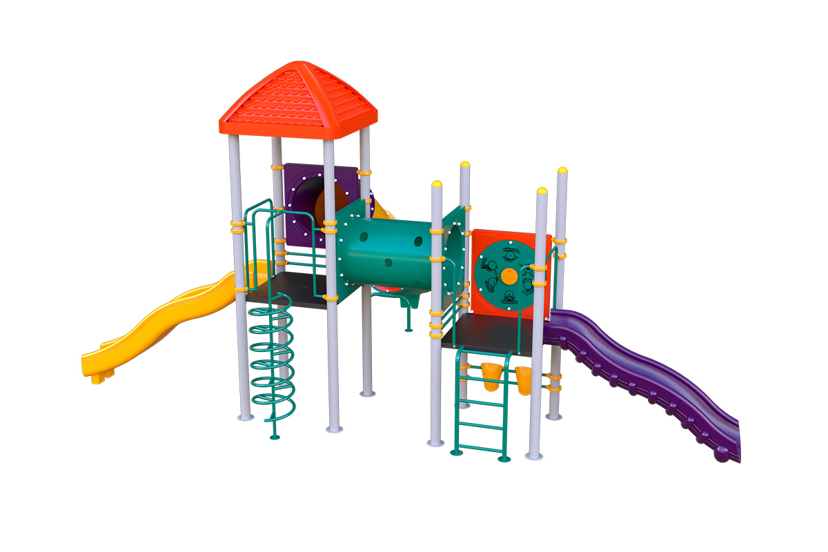 Juego infantil clásico que contiene; 1 tobogán recto, 2 resbaladillas rectas, 1 trepador en espiral, 1 túnel recto, 1 escaleras rectas, 1 bongos musicales, 1 panel twister. Acabado en pintura electrostática, libre de metales pesados, que garantiza una mayor durabilidad del producto. Componentes de plástico de alta densidad con protección UV.