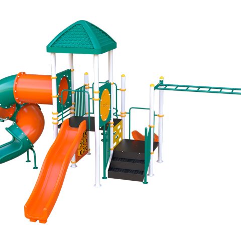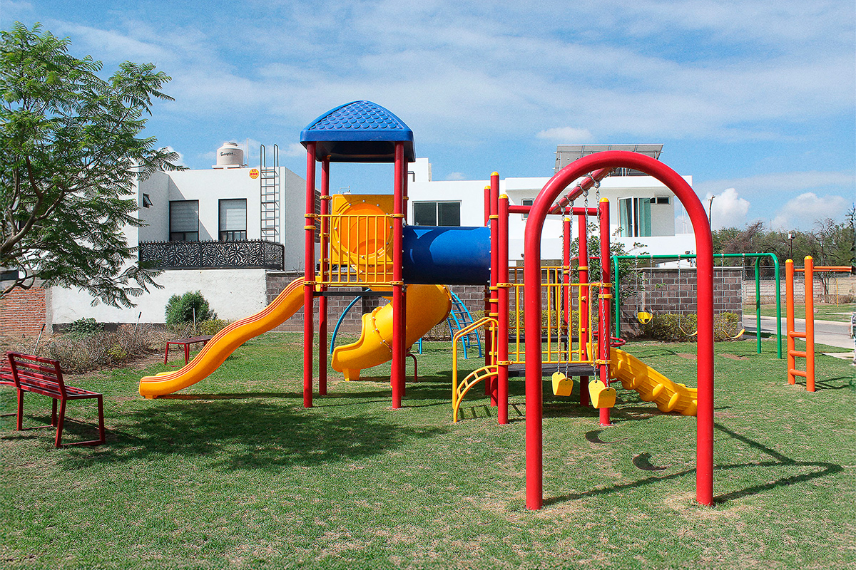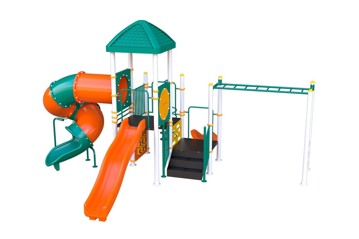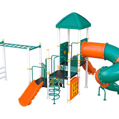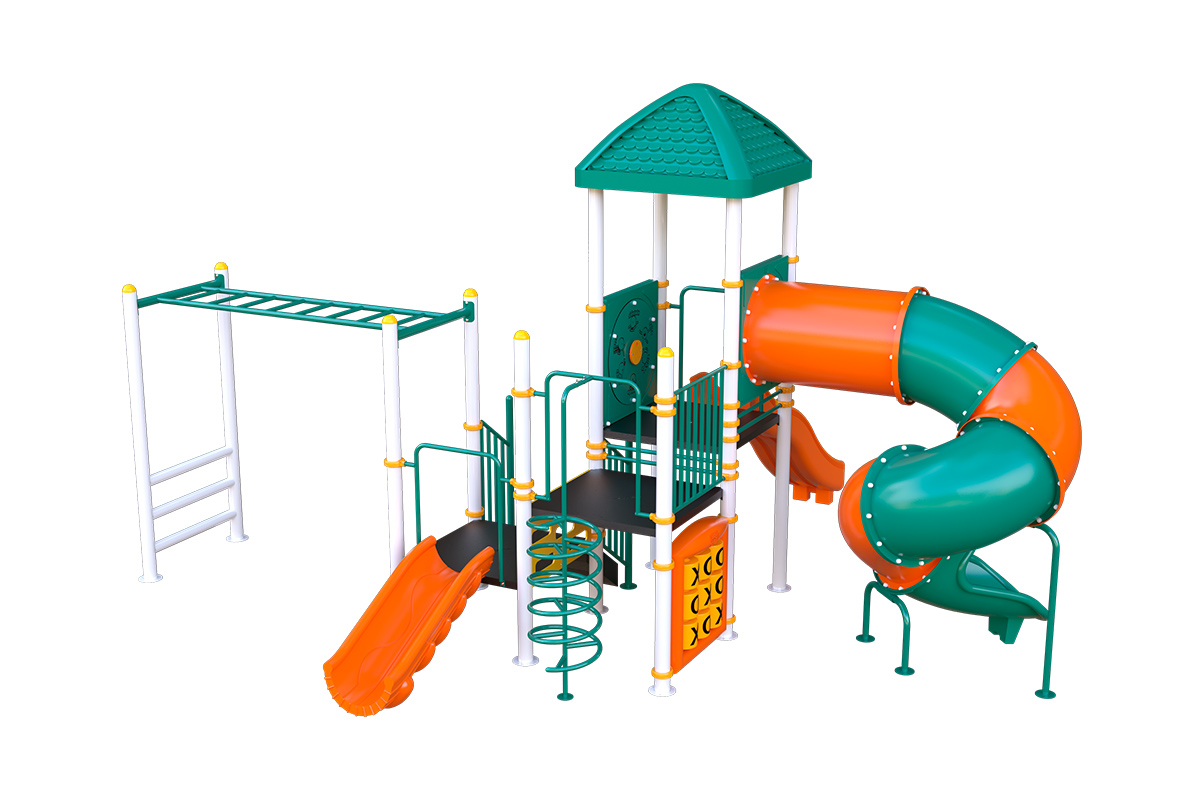 Juego infantil clásico que contiene; 1 tobogán en espiral, 2 resbaladillas rectas, 1 trepador en espiral, 1 escalador plástico entre niveles, 1 pasamanos recto, 1 escaleras de fácil acceso, 1 panel twister, 1 panel gato. Acabado en pintura electrostática, libre de metales pesados, que garantiza una mayor durabilidad del producto. Componentes de plástico de alta densidad con protección UV.