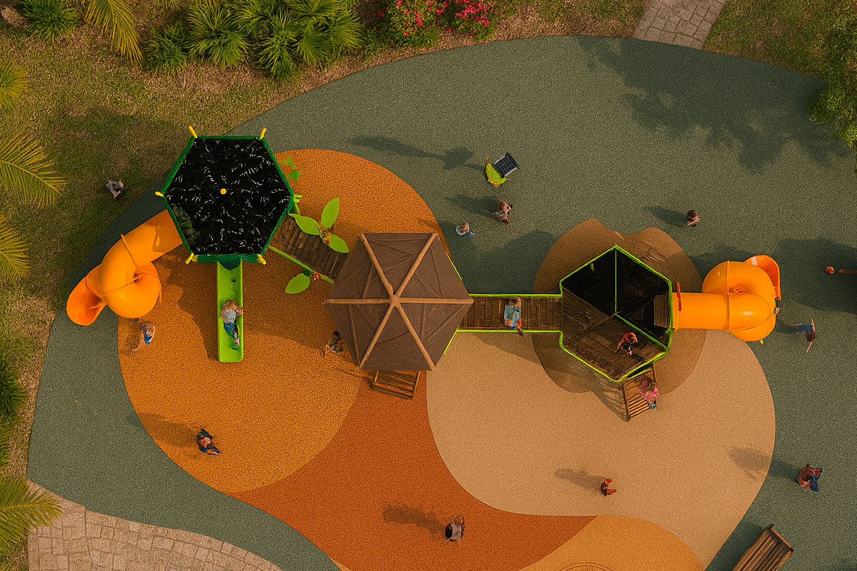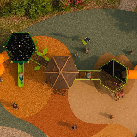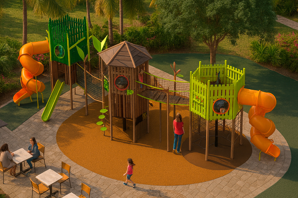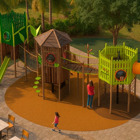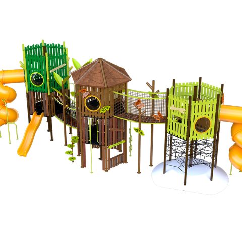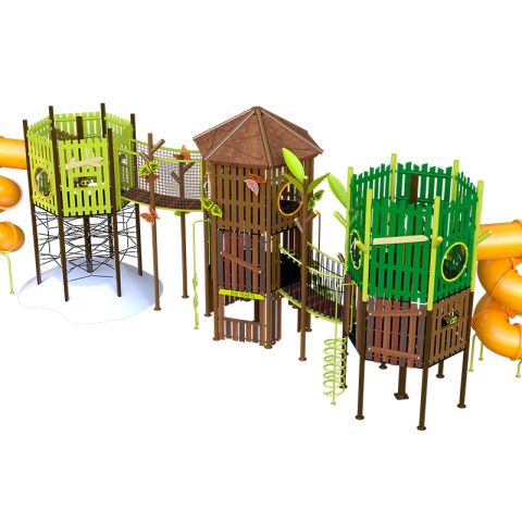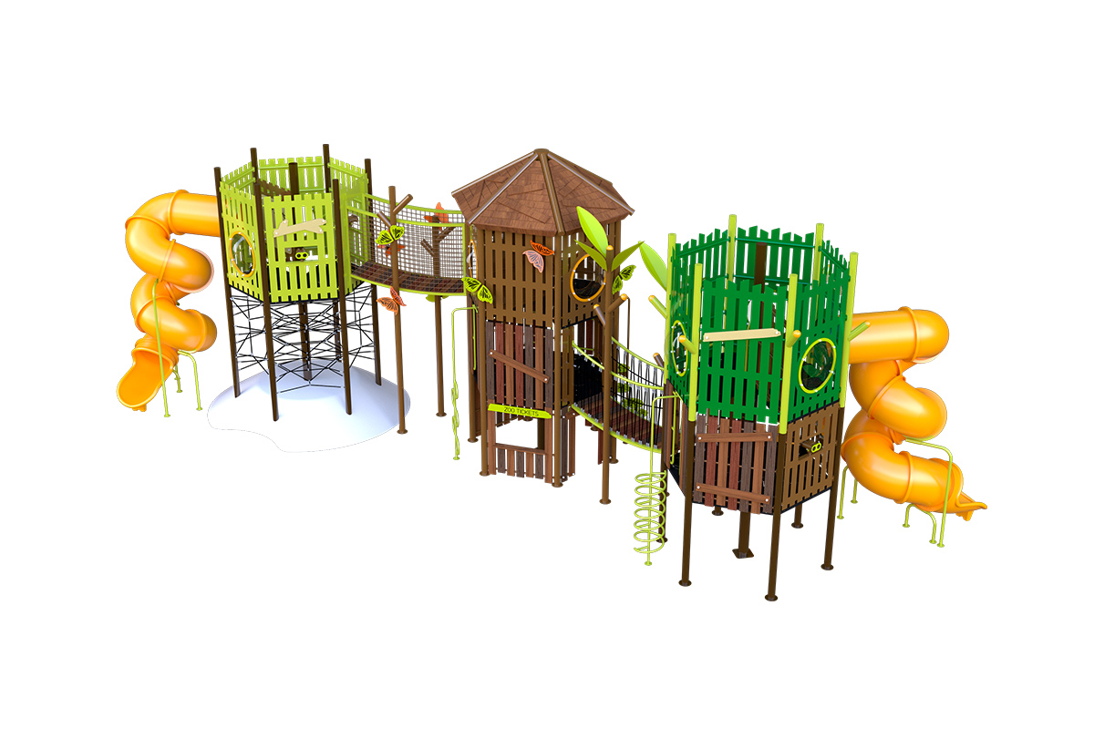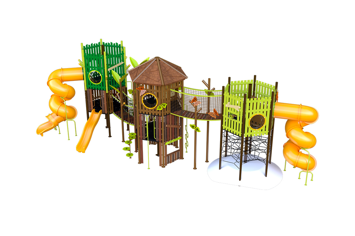 Juego especial de tres torres con temática de villa; incluye 2 toboganes en espiral, 1 resbaladilla recta, 2 puentes colgantes de cuerda, 3 trepadores de cuerda, 2 trepadores lily pads, 1 tubo de bomberos, 1 trepador gusano, 3 binoculares, 3 paneles didácticos, 8 paneles burbuja, 1 panel ventana, 2 paneles juego de roles y mariposas decorativas. Acabado en pintura electrostática, libre de metales pesados, que garantiza una mayor durabilidad del producto.