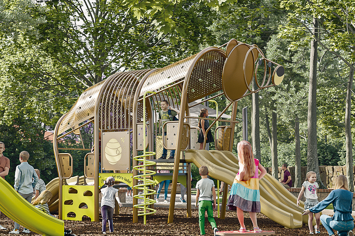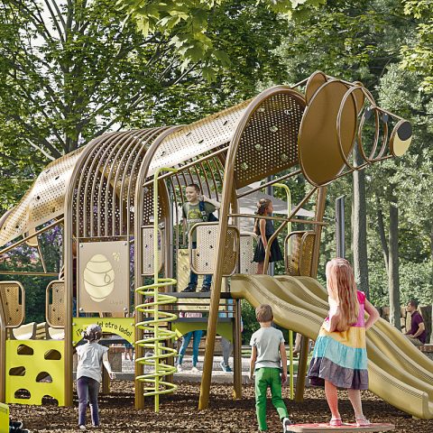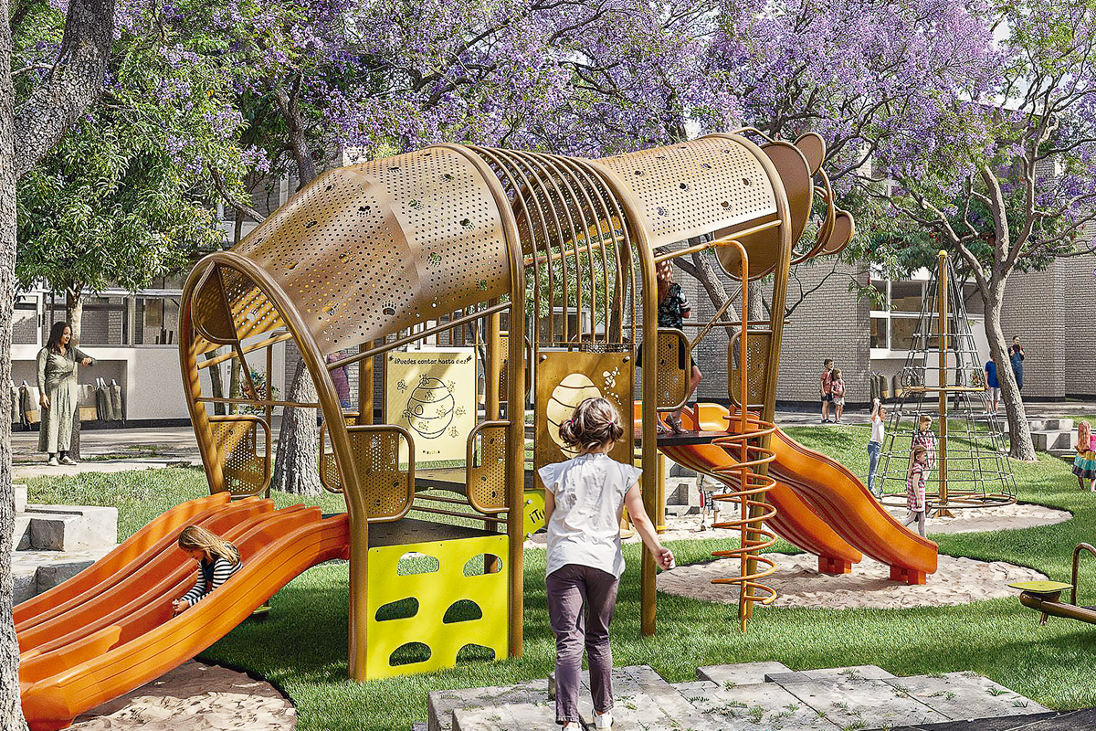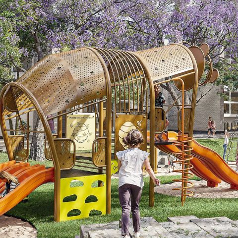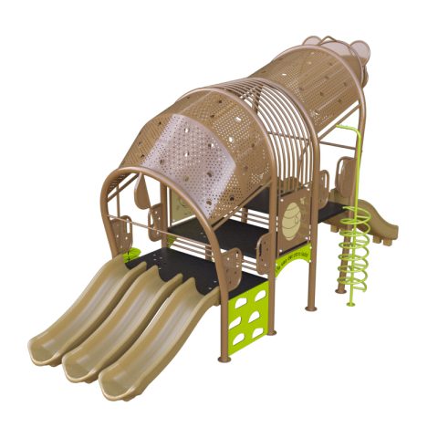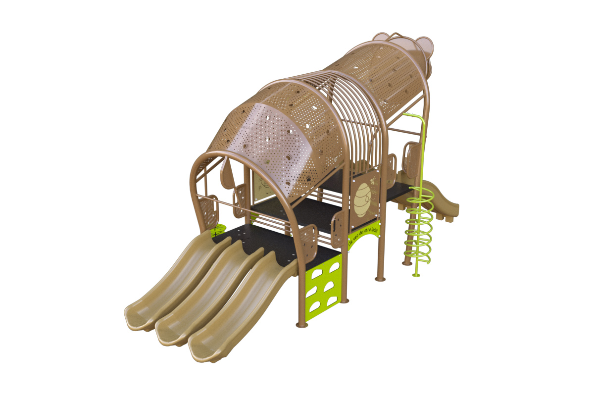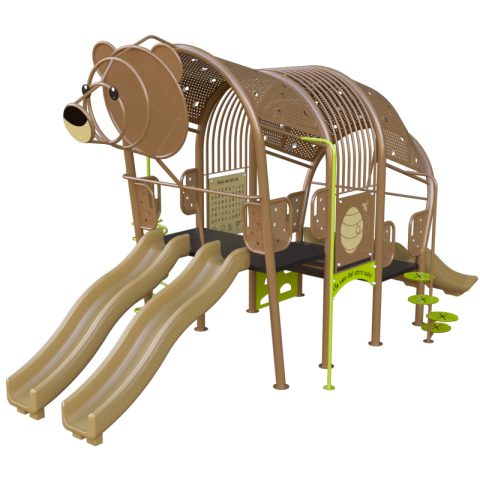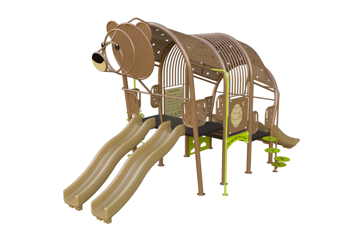 Juego temático de oso; incluye 5 resbaladillas rectas, 1 trepador lilypads ascendente, 1 rapel de polietileno ascendente, 1 trepador en espiral, 1 tubo de bomberos, 1 tunel y 2 paneles didácticos. Acabado en pintura electrostática, libre de metales pesados, que garantiza una mayor durabilidad del producto. Componentes de plástico de alta densidad con protección UV.