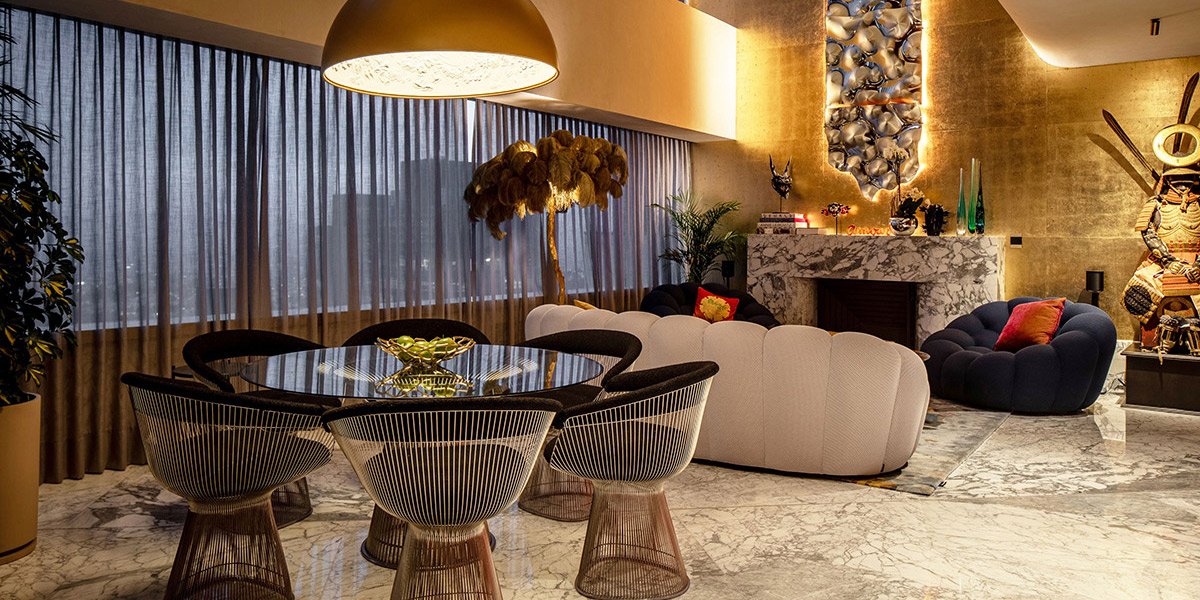 Desde el ingreso, una escalera de caracol en acero y mármol arabescato con pasamanos de latón marca el tono escultórico del espacio. Frente a ella, una cocina abierta en dolomita blanca y chapa negra se funde con la zona social de doble altura. Un muro cubierto en pan de oro sostiene una escultura de Ricardo Sánchez elaborada con espejos termoformados, generando reflejos que transforman el ambiente.