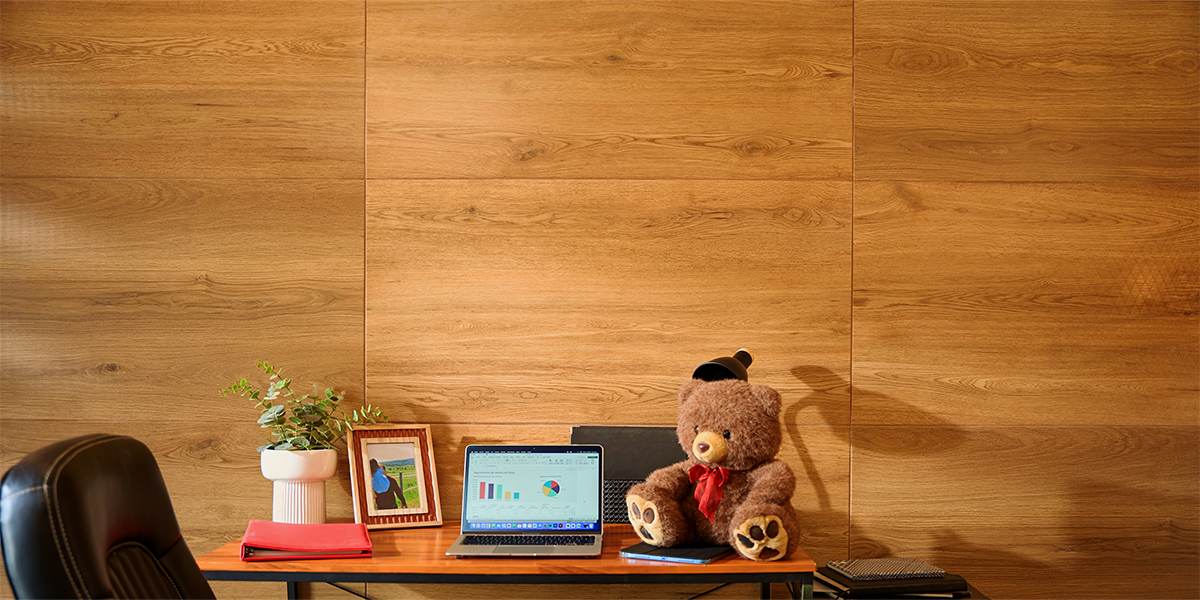 Si quieres ir más allá de la pintura o el papel tapiz, los acabados de madera son una gran apuesta. Siempre aportan calidez, son perfectos par salas de descanso, estudios o como cabecera en una recámara. Dos opciones que combinan buen diseño con facilidad de instalación: Madera Apente en acabado mate y Madera Sandoval, ambas de Lamosa.